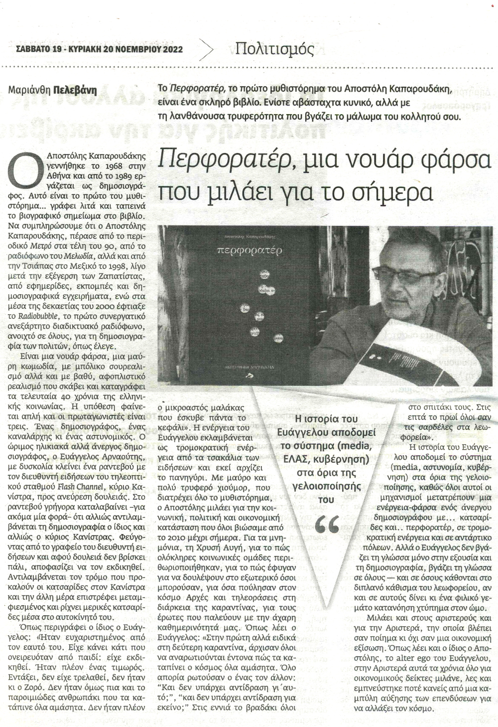 Κριτική παρουσίαση του Περφορατέρ στην εφημερίδα Πριν, από την Μαριάνθη Πελεβάνη.